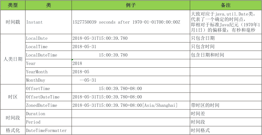 | public class TimeIntroduction { public static void testClock() throws InterruptedException { Clock c1 = Clock.systemUTC(); System.out.println(c1.millis()); Clock c2 = Clock.systemDefaultZone(); Clock c31 = Clock.system(ZoneId.of("Europe/Paris")); System.out.println(c31.millis()); Clock c32 = Clock.system(ZoneId.of("Asia/Shanghai")); System.out.println(c32.millis()); Clock c4 = Clock.fixed(Instant.now(), ZoneId.of("Asia/Shanghai")); System.out.println(c4.millis()); Thread.sleep(1000); System.out.println(c4.millis()); Clock c5 = Clock.offset(c1, Duration.ofSeconds(2)); System.out.println(c1.millis()); System.out.println(c5.millis()); } public static void testInstant() { Instant instant1 = Instant.now(); System.out.println(instant1.getEpochSecond()); System.out.println(instant1.toEpochMilli()); Clock clock1 = Clock.systemUTC(); Instant instant2 = Instant.now(clock1); System.out.println(instant2.toEpochMilli()); Clock clock2 = Clock.fixed(instant1, ZoneId.systemDefault()); Instant instant3 = Instant.now(clock2); System.out.println(instant3.toEpochMilli()); String dateTime = "2018-06-07 10:19:00"; DateTimeFormatter format = DateTimeFormatter.ofPattern("yyyy-MM-dd HH:mm:ss").withZone(ZoneId.systemDefault()); Instant.from(format.parse(dateTime)).getEpochSecond() } public static void testLocalDateTime() { LocalDateTime now = LocalDateTime.now(); System.out.println(now);