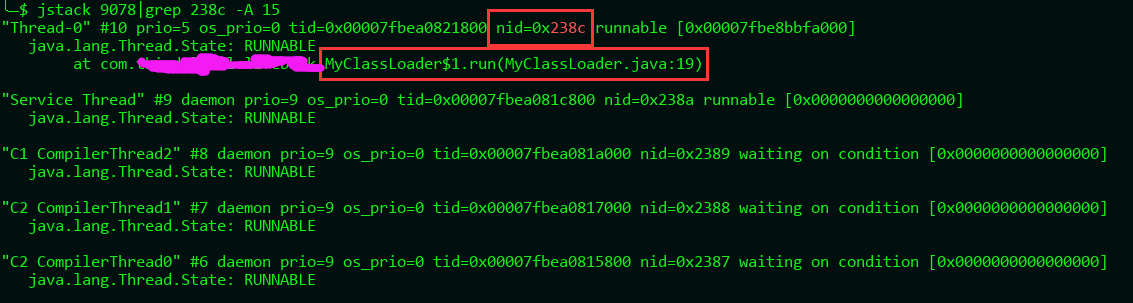 1 | ╰─$ jstack 9078|grep 238c -A 15 |