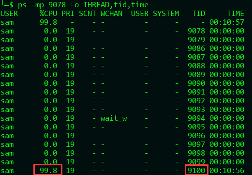线程tid为 9100 的线程,CPU占用率达到了99.8%, 就是这个线程的问题。具体线程方法2