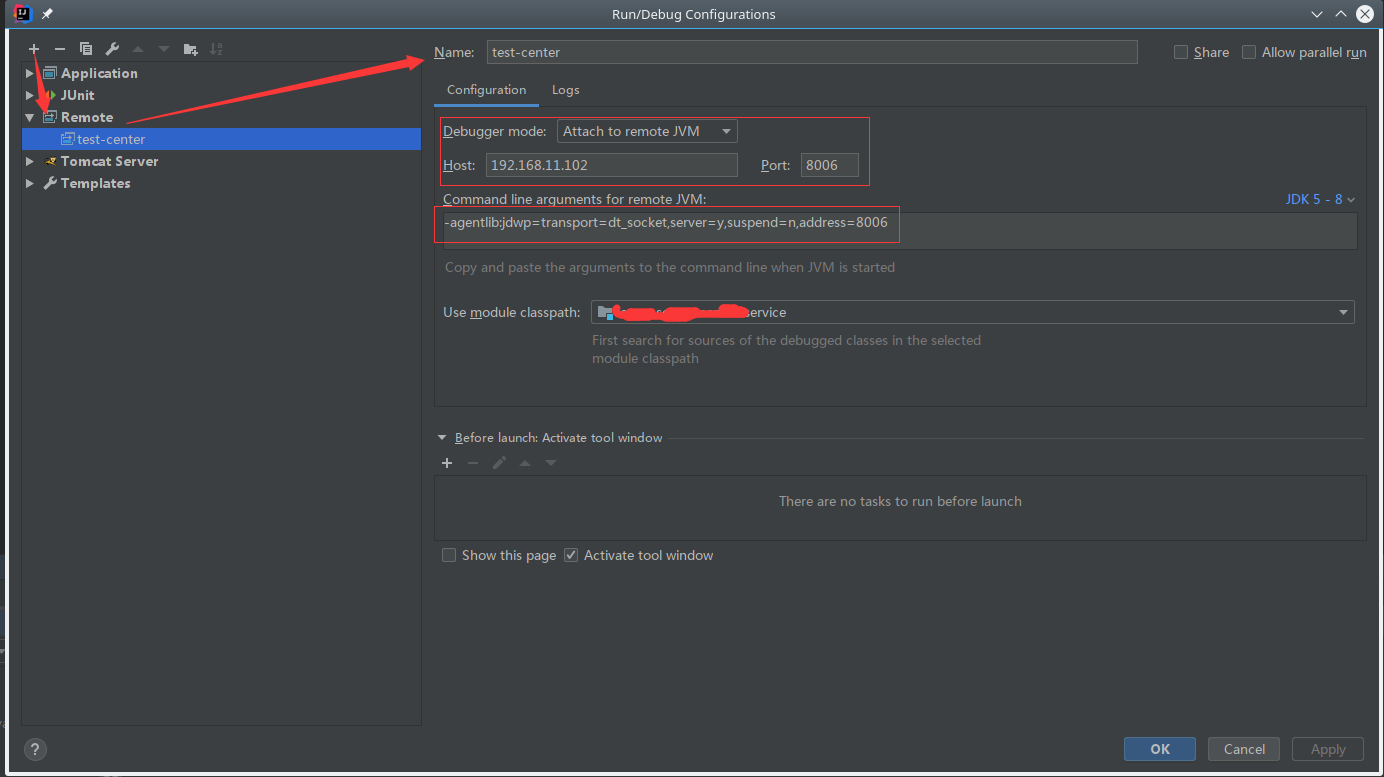 jar -agentlib:jdwp=transport=dt_socket,server=y,suspend=n,address=8006 -jar test-center.jar